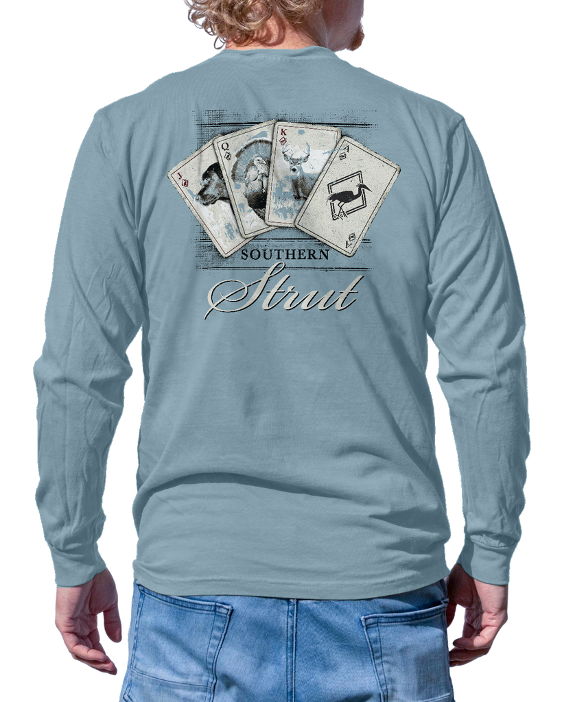 What hand were you dealt on your last hunting trip? As long as you’re wearing Southern Strut’s Hunting Cards Long sleeve tee, every hand is a winner. This shirt features a screen-printed image on the back with Southern Strut’s logo on the front, all on a super-soft tee made from premium, ring-spun cotton. Take a look at as many southern apparel brands as you want, but they won’t get better than this tee from Southern Strut.