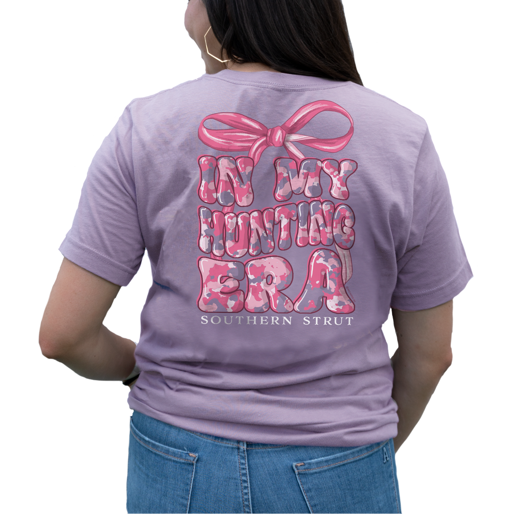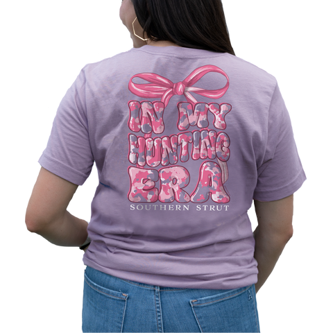 Step into your hunting era with confidence and camo. This lavender tee features bold bubble-style lettering filled with pink camo and tied together with a sassy bow. Designed for the ladies who can rock boots, bows, and a rifle all in one weekend.