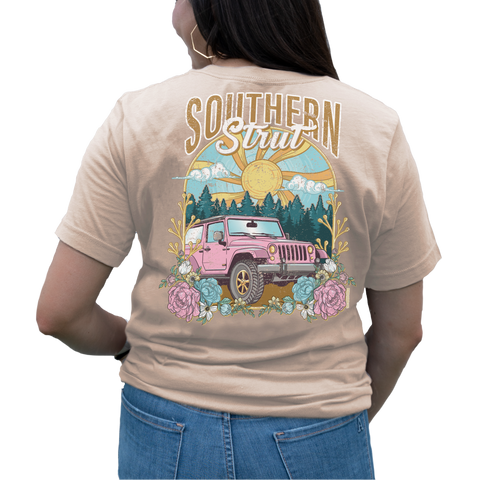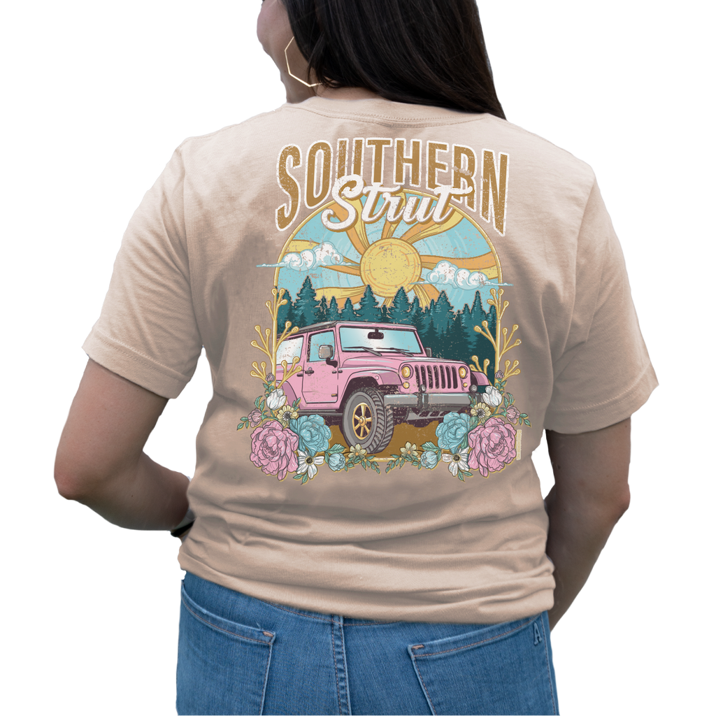 Hit the backroads in style. The Jeep Sunrise tee blends outdoor freedom with feminine flair, featuring a pink Jeep against a glowing sunrise, pine forest, and floral accents. It’s a perfect match for the girl who’s as wild as she is grounded. Whether you're cruising country roads or chasing sunsets, this shirt rides with you.